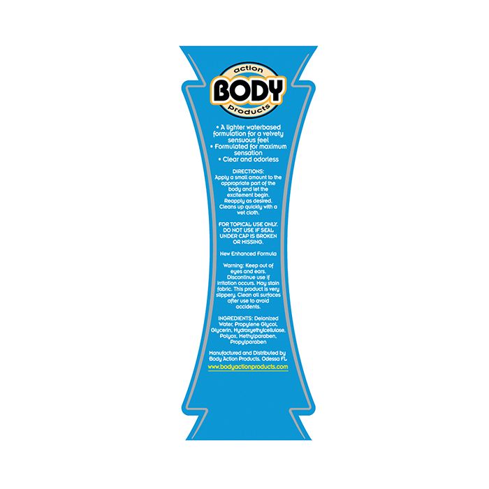 Body Action Ultra Light is for maximum sensation and is a lighter formulation for a slick, velvety, and sensuous feel. This product is clear, odorless, and is latex compatible. Cleans up quickly with a wet cloth. Let the fun begin!