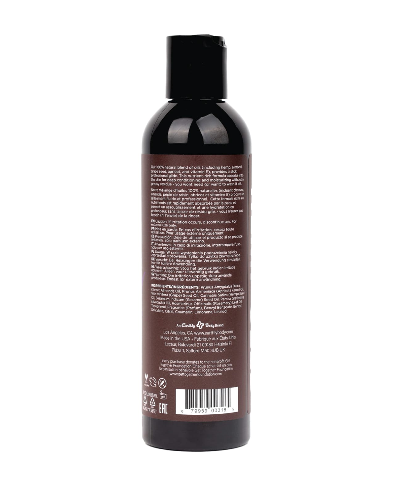 Why settle for boring and bland massage oil when you can indulge in the finest of natural ingredients, and scents that suit each mood? Our Massage & Body Oil’s safe and effective ingredients are perfect for even the most sensitive skin. Make your massage mean more with Hemp Seed’s skin-nourishing Massage & Body Oil: Emollient-rich oil blend works to lubricate skin and provide superior slip while leaving a non-greasy residue on skin after massage. Almond oil softens skin and promotes skin strength with nourishing vitamin E and D, as well as anti-aging workhorse vitamin A. Omega 3, 6, and 9 fatty acids found in Hemp Seed oil act as an anti-inflammatory agent soothing irritated and sensitive skin. Linoleic, oleic acid and vitamins A and E found in Apricot oil help skin regain its elasticity, clarity and suppleness. Rosemary oil stimulates blood flow, increases circulation and rejuvenates, thus enhancing the massage experience. Grapeseed oil containing anti-aging polyphenols and vitamin C helps prevent clogged pores, and antioxidants help slow down the aging process.