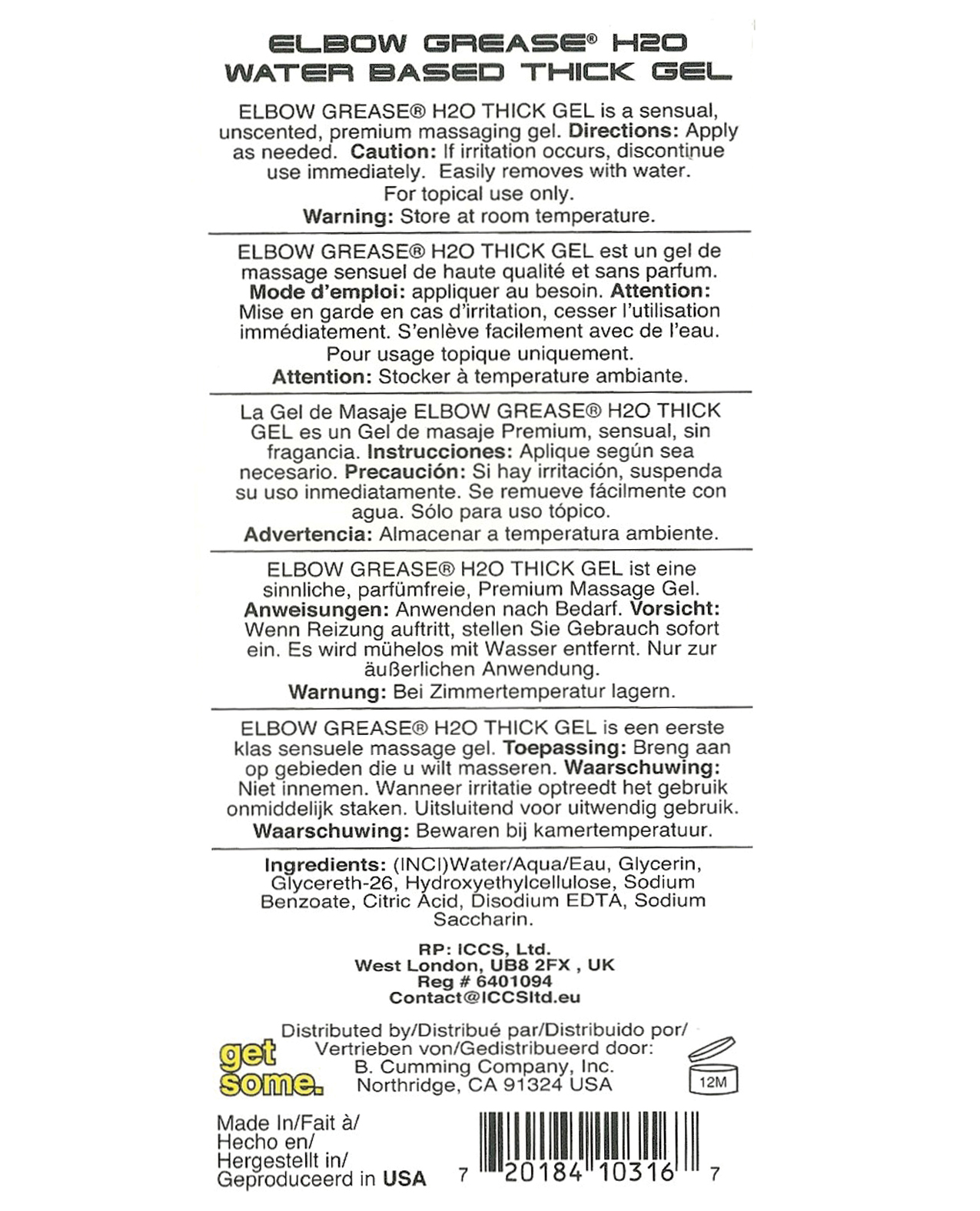 Elbow Grease H2O Thick Gel has a soft velvety smooth texture mimicking the body’s own natural lubrication. It is water-based, long lasting, greaseless, safe, latex compatible, odorless and washes of with water leaving no residue on the skin. Keep some handy at all times!