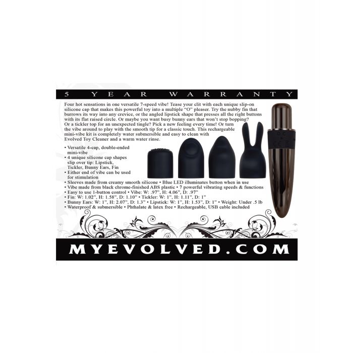 Four hot sensations in one versatile 7-speed vibe! Tease your clit with each unique slip-on silicone cap that makes this powerful toy into a multiple “O” pleaser. Try the nubby fin that burrows its way into any crevice, or the angled lipstick shape that presses all the right buttons with its flat raised circle. Or maybe you want busy bunny ears that won’t stop bopping? Or a tickler top for an unexpected tingle? Pick a new feeling every time! Or turn the vibe around to play with the smooth tip for a classic touch. This rechargeable mini-vibe kit is completely water submersible and easy to clean with Evolved Toy Cleaner and a warm water rinse.