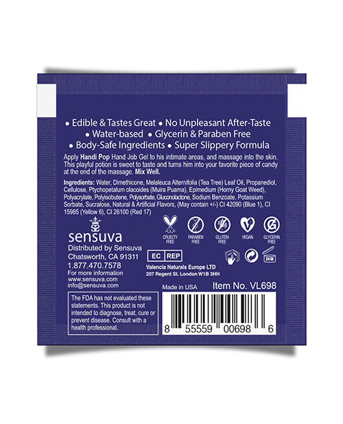 Let your hands work their magic to give him a lap massage he will never forget. HandiPop was created to be ultra slippery so that it extends the length of your hand massage, inviting him to enjoy every single one of your tickles, glides, squeezes and caresses to his favorite body part. It is fun to use with just your hands, OR combine it with other men’s pleasure products like masturbation sleeves, textured toys and anything with vibration. At the end of your hand massage you can turn him into your favorite lollipop because this playful potion tastes absolutely amazing, which makes it a pleasure for you both