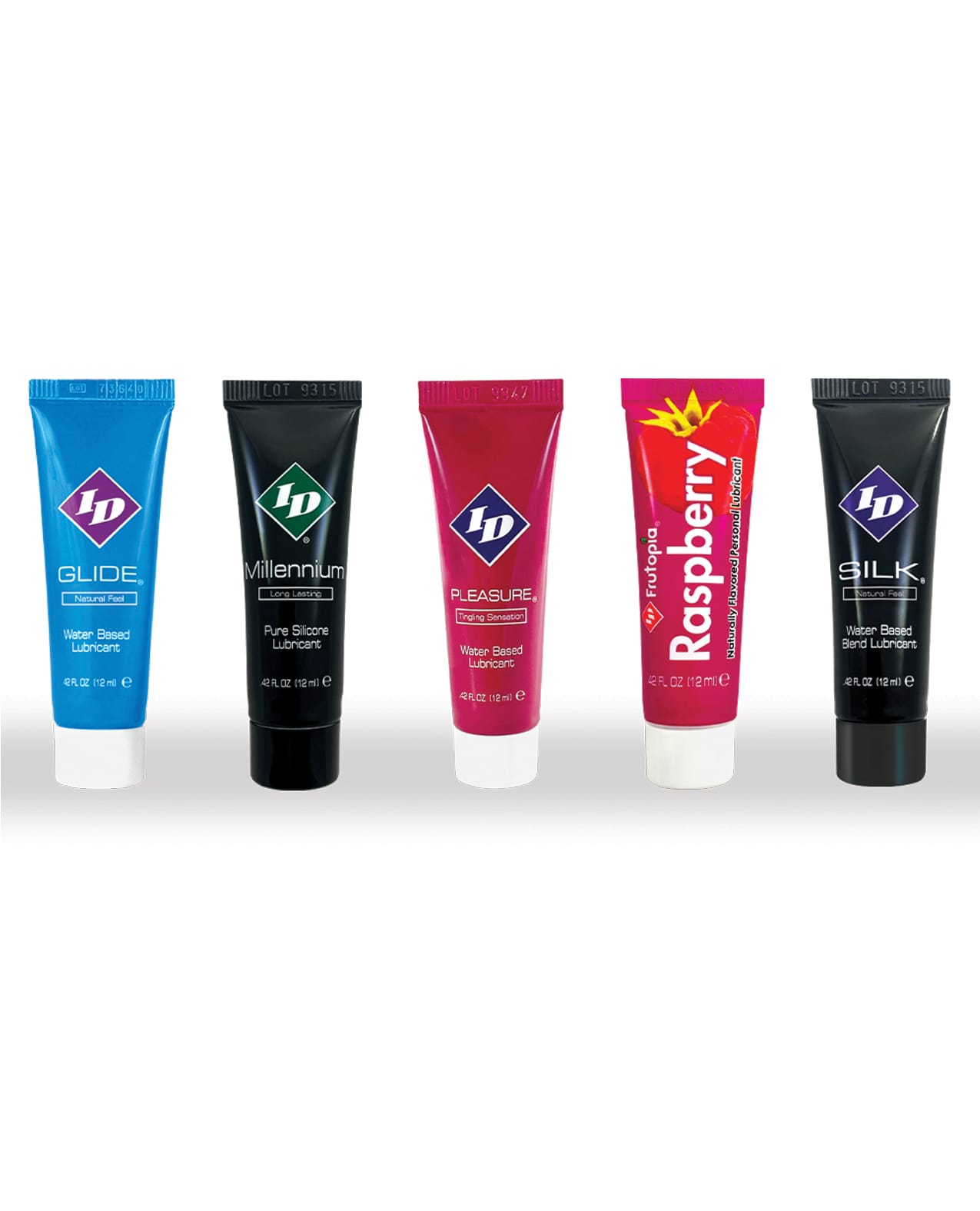 This sampler pack of five 12 ml tubes includes 4 water based lubricants and one silicone based lubricant. Sampe the original ID Glide, a delicious Juicy Lube flavor, tingling sensation of ID Pleasure, ultra long lasting ID Millennium or the one and only ID Silk, a water-silicone hybrid hydrolized silk for incredible moistuizing properties.