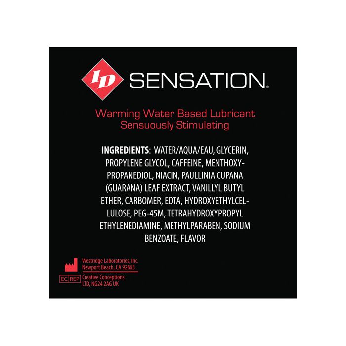 Newly formulated water-based ID Sensation is now a warming lubricant! With the same consistency as our best selling ID Glide, ID Sensation creates gently warming stimulation and ignites passion in one bottle. Warms on contact. Latex safe. Water-based. Non-staining. Adult toy safe. Increases stimulation.