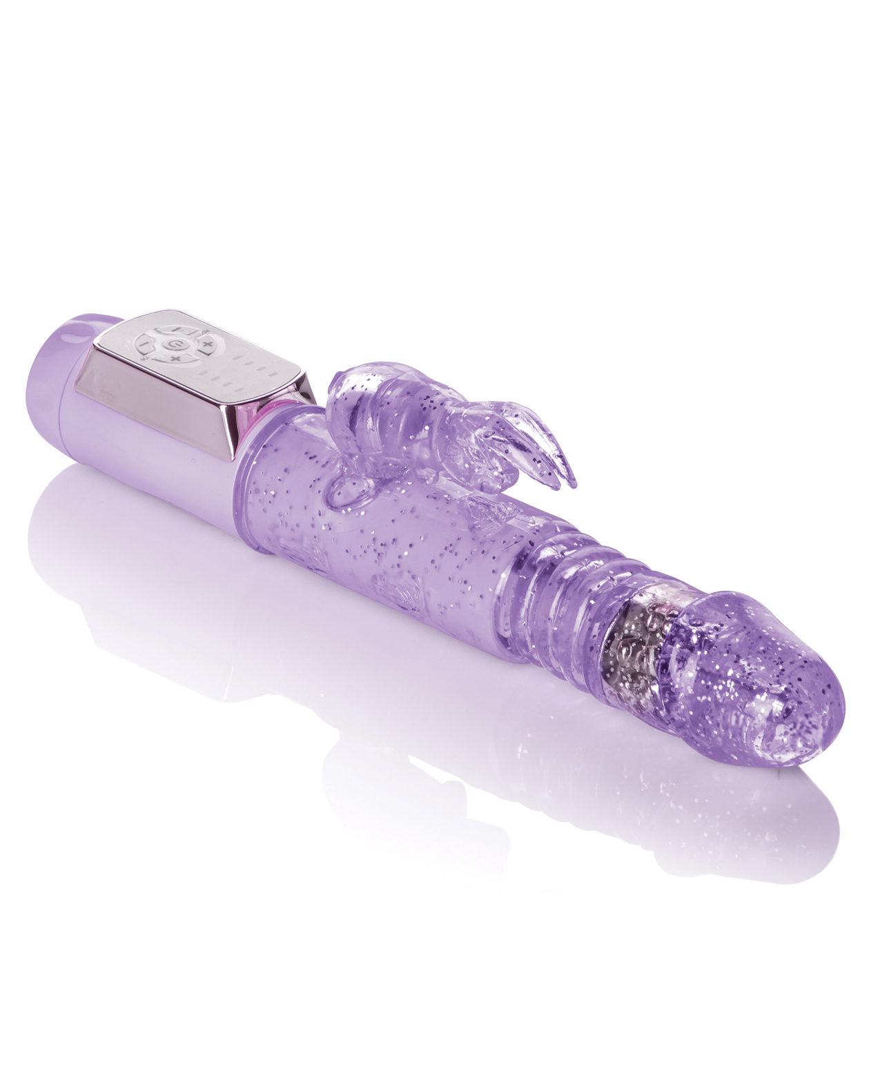 The glitter finish rabbit massagermeasures a compact 5″ x 1.25″/12.75cm x 3.25cm and is made from smooth and soft TPR, and has an easy push button ABS controller with auto off switch. The power-packed thrusting massager has a flexible shaft with pleasure ridges, a smooth rounded tip, and a curvy bunny teaser, with flickering ears. Use it to massage, arouse and stimulate sweet pleasure spots all over the body.