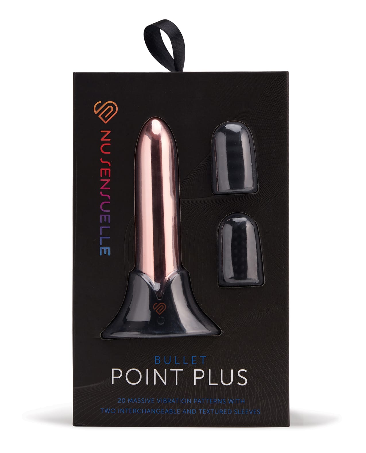 Taking something great and making it better can be a challenge, especially when you’re talking about our most powerful and best-selling bullet, The Point. But, we took a look and thought: “Challenge accepted!” We started with all the awesomeness that is The Point: a silky smooth, twice-dipped silicone exterior concealing our powerful motor that delivers Massive. Vibration. Generation. To that tiny powerhouse, we added controls to let you scroll up and down through power settings and designed two amazingly unique, interchangeable sleeves to customize your pleasure. Oh yeah, we also made it 40% MORE powerful! The Point Plus brings you a whole new world of sensations — all while keeping you in total control. Of course, it shares the same great benefits of its predecessor — like 20 vibration patterns, a long-lasting, rechargeable battery, and our proprietary design that distributes the vibration uniformly across the full surface of the toy — allowing you to enjoy The Point Plus’s sensational stimulation in any position. The Point Plus is 100% body safe, 100% waterproof. Includes a sturdy charging stand and USB cable. Two Year Warranty