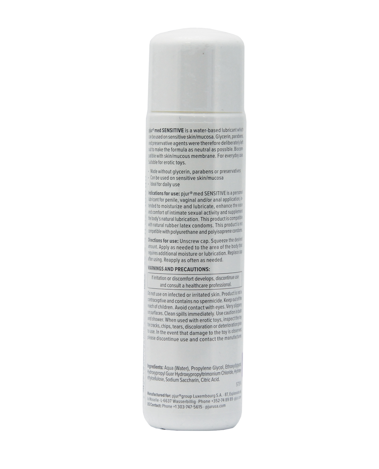 pjur med SENSITIVE glide is specifically developed for very sensitive mucous membranes in the genital area. Glycerin, parabens, and preservative agents were therefore deliberately left out to make the formula as neutral as possible thus ensuring maximum compatibility with mucous membranes. No preservatives, paraben & glycerin free. For very sensitive mucous membrane in the genital area.Dermatologically safe. Directions for use : Apply to any area of the body where extra moisture is desired. Suitable for daily use. Compatible with latex condoms. Ingredients: Aqua (Water), Propylene Glycol, Ethoxydiglycol, Hydroxypropyl Guar Hydroxypropyltrimonium Chloride, Hydroxyethylcellulose, Sodium Saccharin, Citric Acid.