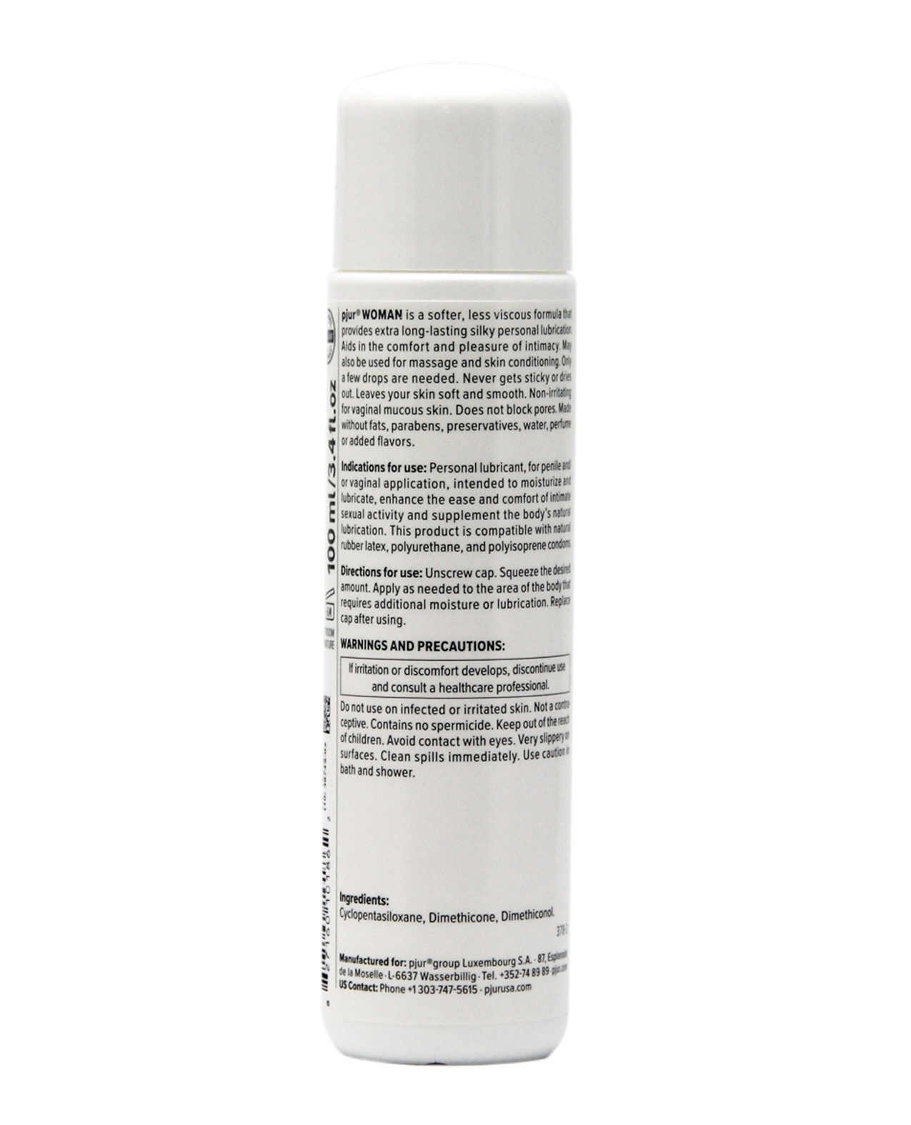 Woman Silicone is a less viscous silcone personal lubricant for a softer experience. This moisture enhancing personal lubricant is hypoallergenic, latex condom safe, and ideal for daily use. Medical grade ingredients and the unique formula makes it her softest silicone personal lubricant.Designed for her; enhances natural moisture; safe for soft and sensitive skin; and latex condom safe. From Pjur. 100ml bottle