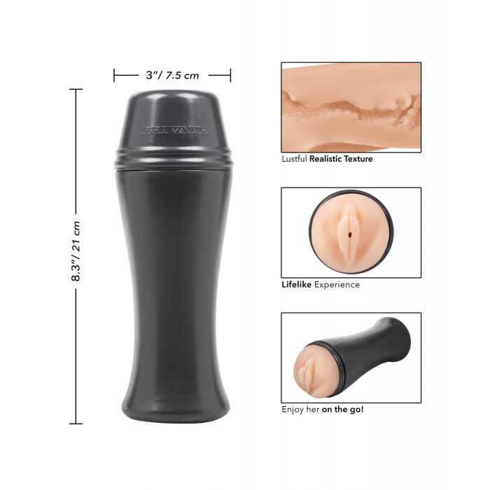 Indulge in your naughtiest fantasies whenever and wherever the urge takes you with the Private Femme Fatale To Go. This compact, travel proof masturbator is made to thrill with adjustable suction intensity, realistic textured chamber and naughty life-like opening. Keep the good times rolling when your slip this self contained sleeve into your suitcase or overnight bag for a naughty realistic feeling stroking experience wherever your travels take you.