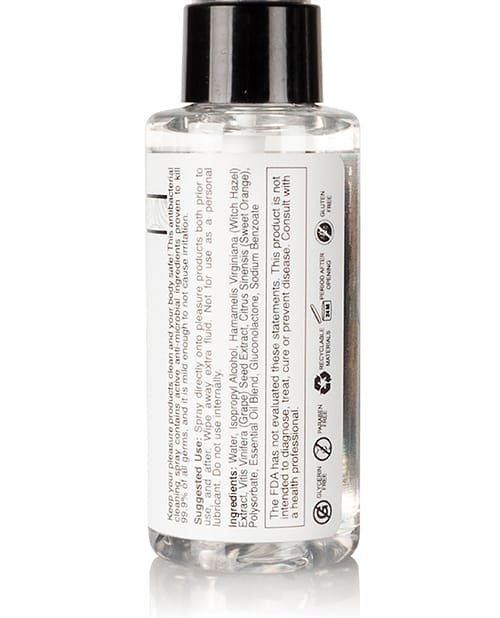Keep your pleasure products clean and your body safe! Think Clean Thoughts is a quick and simple-to-use anti-bacterial cleaning spray that contains active anti-microbial ingredients proven to kill 99.9% of all germs, and it is mild enough to not cause irritation to delicate tissue. Spray directly onto pleasure products both prior to use, and afterward. Wipe away extra fluid. Not intended as a personal moisturizer (do not use internally). • Made with healthy ingredients such as: water, witch hazel extract, grape seed extract, sweet orange and other true essential oils. • No parabens, petrochemicals, or glycerine.