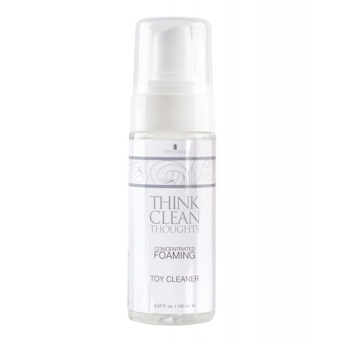 Think Clean Thoughts is a quick and simple-to-use anti-bacterial foaming toy cleaner, containing active anti-microbial ingredients proven to kill 99.9% of all germs, and it is mild enough to not cause irritation to delicate tissue. Made with healthy ingredients such as: water, witch hazel extract, grape seed extract, sweet orange and other true essential oils. Think Clean Thoughts is a better choice for cleaning pleasure products than standard bar hand and body soaps because it is oil-free and will not break down toy materials, nor does it leave any residue that may be irritating to delicate tissue.