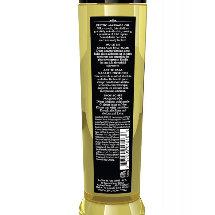 This 100% natural oil with intoxicating fragrances glides easily and smoothly over the skin without leaving a greasy residue. Pour a small amount into the palm of your hand and rub your hands together to bring the oil to body temperature. If desired, you can heat the oil in hot water for an even hotter touch. Ingredients (I.N.C.I.): Sweet Almond Oil/Huile d’amande douce (Prunus Amygdalus Dulcis Oil), Grape Seed Oil/Huile de pépin de raisin (Vitis Vinifera Seed Oil), Sesame Oil/Huile de sésame (Sesamum Indicum Seed Oil), Avocado Oil/Huile d’avocat (Persea Gratissima Oil), Pecan Oil/Huile de pacane (Carya Illinoensis Seed Oil), Safflower Oil/Huile de carthame (Carthamus Tinctorius Seed Oil), Fragrance (Parfum), Vitamin/Vitamine E (Tocopherol), Amyl Cinnamal, Benzyl Alcohol, Citral, Eugenol, Benzyl Salicylate, Coumarin,Limonene, Methyl 2-Octynoate, Geraniol, Farnesol, Butylphenyl Methylproponial, Linalool, Benzyl Benzoate, Citronellol, Hexyl Cinnamal, Alpha-Isomethyl Ionone, Butylated Hydroxytoluene (BHT), Lyral, Cinnamyl Alcohol, IsoEugenol, Hydroxycitronellal, Hydroxyisohexyl 3-cyclohexene-Carboxaldehyde.