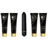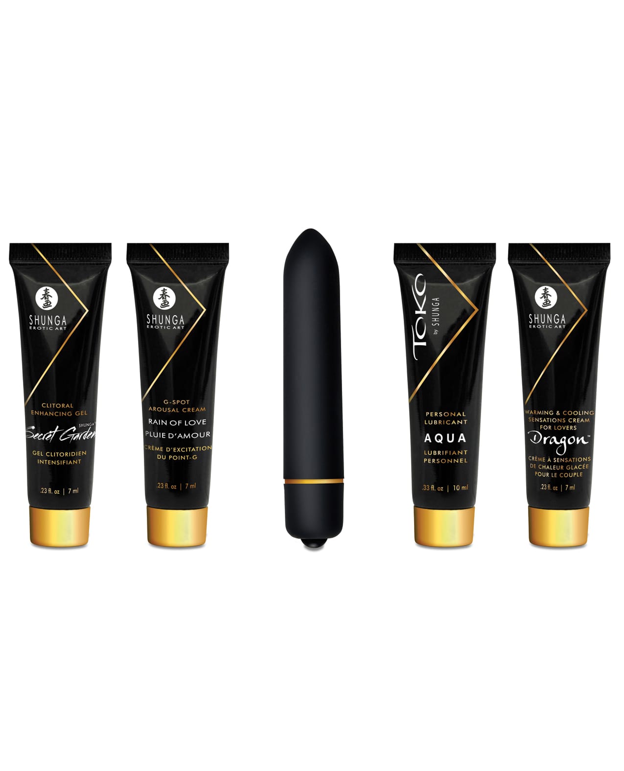 Explore your Naughty Side. This collection of miniature products will help you explore and break all taboos. Nothing surpasses the desire to discover the lust of flesh by yourself or with your lover. Collection includes: Toko aqua personal lubricant, Secret Garden clitoral enhancing gel, Dragon warming and cooling sensations cream, Rain of Love G-spot arousal cream, 10 speed vibrating bullet ( requires 1 AAA battery – not included)