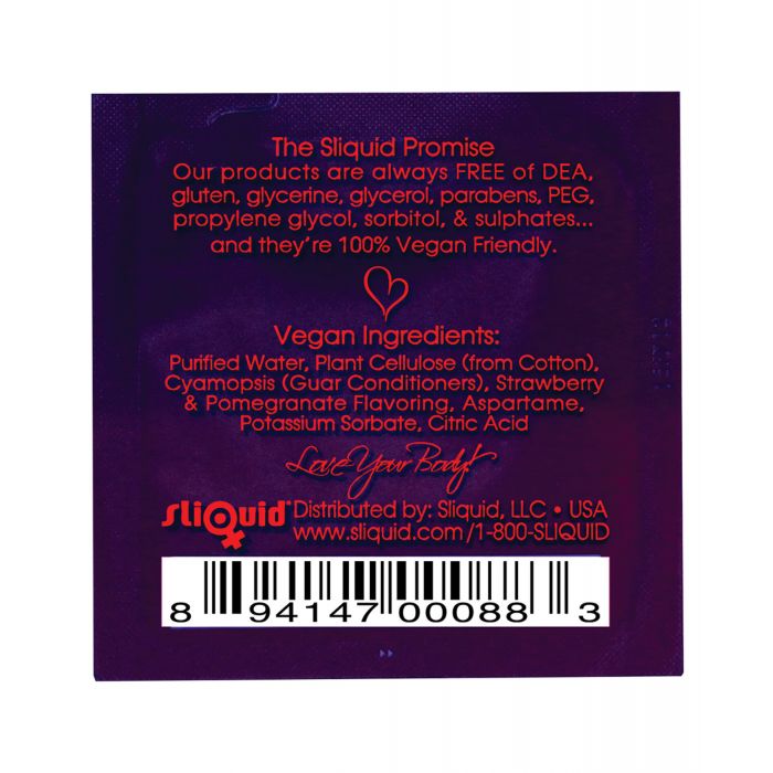 Sliquid Naturals Swirl is a group of flavored water based lubricants, all glycerin and paraben free. All Swirl formulations start with our original Naturals H2O water based lubricant, and add flavoring and a hint of aspartame to sweeten. Our flavors are subtle, and are intended to enhance your taste, not disguise. All Sliquid products are formulated by sensitive women, for sensible women, and will never cause yeast infections or UTI’s. Sliquid Naturals Swirl is water-based and water soluble, 100% vegan friendly, long lasting and easy to clean up, glycerin and paraben free, hypoallergenic and non-toxic, lightly flavored to enhance taste, non-staining, unflavored, and unscented, and uniquely blended to enhance your body’s own natural lubrication. Made with Purified Water, Plant Cellulose (from Cotton), Cyamopsis (Guar Conditioners), Natural Flavoring, Aspartame, Potassium Sorbate, Citric Acid. Strawberry Pomegranate flavor. All Sliquid products are Glycerine Free, Paraben Free, Hypoallergenic, and proudly Made in the USA. Slight variations in color or consistency may occur due to the key natural ingredient plant cellulose used in this product.