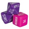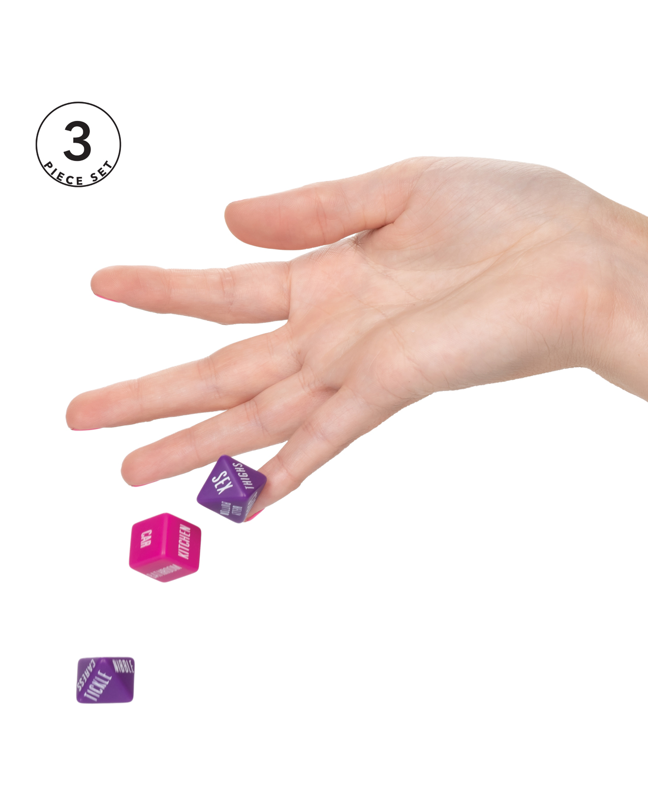The game comprises of 3 colored dice. The 2 octagonal dice feature playful and arousing functions for you and your lover to perform on each other. The classic square die indicates the perfect location for your steamy spontaneous pleasure. Take turns rolling the dice, and following the instructions for at least two minutes. Enjoy tickling toes or caress privates until your time is up. Once your lover throws the dice, you can relax and enjoy your turn at receiving the heightened sensuous pleasure.