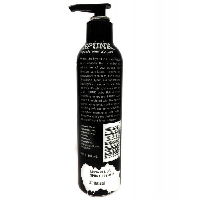 SPUNK Lube Hybrid is a water based hybrid lubricant that looks and feels like CUM. It’s white and creamy, and feels unlike any other lubrication available. With SPUNK Lube Hybrid you get the best of both worlds. Lube that lasts long like silicone and cleans up easily like water. SPUNK Lube Hybrid is condom friendly, safe to use with all sex toys, and it won’t stain your sheets or ruin your gear. SPUNK Lube Hybrid is silky smooth and long lasting. It doesn’t get sticky and it doesn’t smell or taste like chemicals. SPUNK Lube Hybrid is the perfect all around personal lubricant for any occasion.