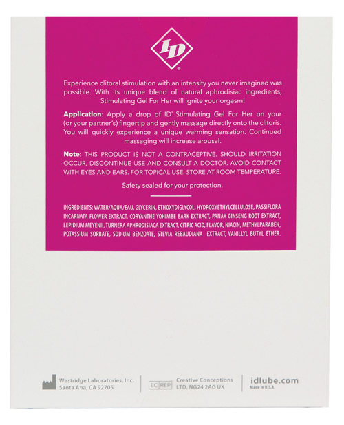 For some of the best female stimulation and enhanced arousal, ID Stimulating Gel for her is the perfect choice! Feel as this exquisite stimulating gel works its magic on and throws you into fits of orgasmic pleasure. Offering a unique gel aimed to heighten female arousal complements our line of products designed for your pleasure. Using this product will make you more than a little enthusiastic when engaging in acts leading of an erotic nature. Feel the passion of your next tryst come alive in exceedingly exciting ways. This clitoral stimulating gel will take you into space! Ingredients: Water/Aqua/Eau, Glycerin, Ethoxydiglycol, Hydroxyethylcellulose, Passiflora Incarnata Flower Extract, Coryanthe Yohimbe Bark Extract, Panax Ginseng Root Extract, Lepidium Meyenii, Turnera Aphrodisiaca Extract, Citric Acid, Flavor, Niacin, Methylparaben, Potassium Sorbate, Sodium Benzoate, Stevia Rebaudiana Extract, Vanillyl Butyl Ether.