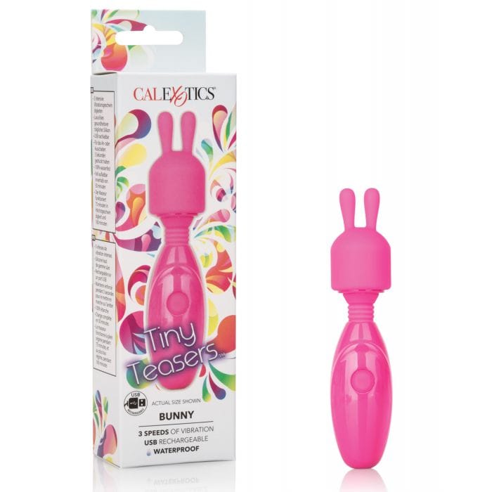 Turn up the heat in your bedroom, in the hot tub or on your next vacation with the discreet Tiny Teasers Bunny. The travel-size mini wand massager will thrill anywhere you go with the flexible neck and 3 intense speeds of vibrations. With only the touch of a button, this whisper quiet vibrating massager easily increases vibration intensity; apply the bunny tip to sweet spots while three powerful vibration speeds pulse and stimulate. Effortlessly control pure pleasure with a single easy-touch silicone button. Hold the easy push- button for 3 seconds to turn on or off.