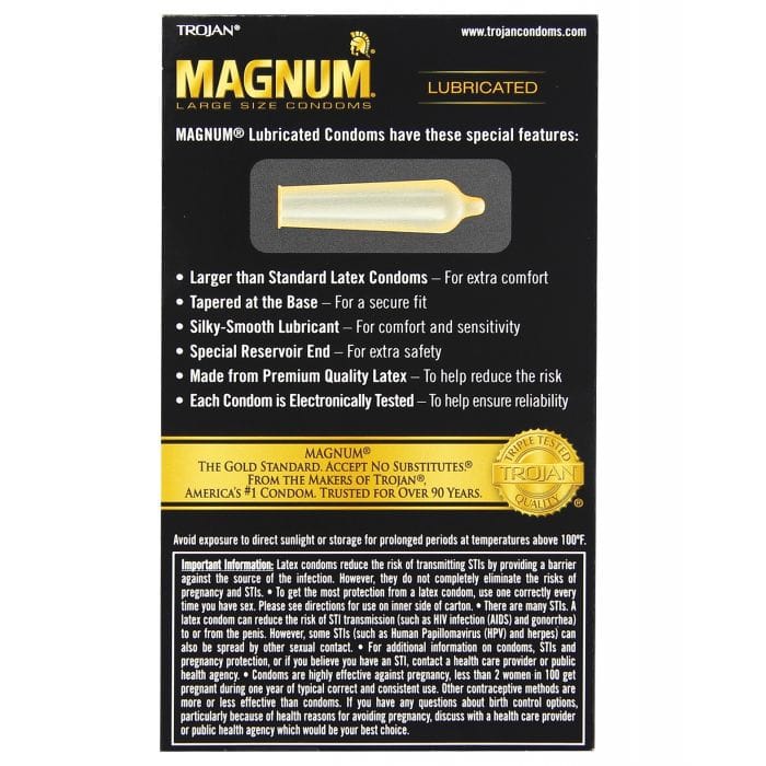 Indulge in pleasure larger than life with Magnum™ Large Size Condoms, brought to you by the creators of Trojan™ and distinguished by their unmistakable gold wrapper. Crafted for superior comfort, these condoms redefine the experience of intimacy, allowing you to savor your best moments. Go big or go home.