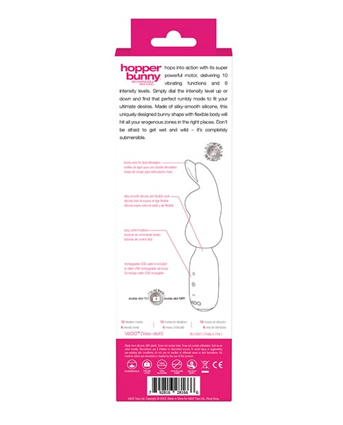 HOPPER BUNNY hops into action with its super powerful motor, delivering 10 vibrating functions and 6 intensity levels. Simply dial the intensity level up or down and find that perfect rumbly mode to fit your ultimate desires. Made of silky-smooth silicone, this uniquely designed bunny shape with a flexible body will hit all of your erogenous zones in the all the right places. Don’t be afraid to get wet and wild – it’s also completely submersible. 100% Silicone. Travel Lock. Waterproof. One Year Warranty.