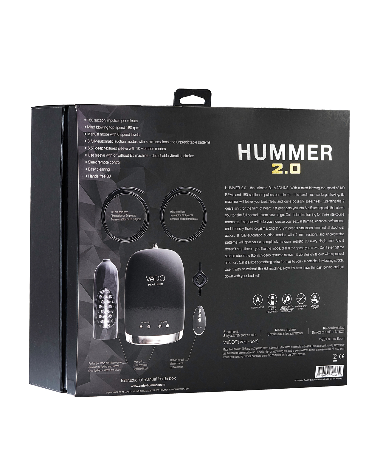 HUMMER 2.0 – the ultimate BJ MACHINE. With a mind blowing top speed of 180 RPMs and 200 suction impulses per minute – this hands free, sucking, stroking, BJ machine will leave you breathless and quite possibly speechless. Operating the 9 gears isn’t for the faint of heart. 1st gear gets you into 6 different speeds that allows you to take full control – from slow to go. Call it stamina training for those intercourse moments. 1st gear will help you increase your sexual stamina, enhance performance and intensify those orgasms. 2nd thru 9th gear is simulation time and all about the ORAL ACTION. 8 fully-automatic suction modes with 4 min sessions and unpredictable patterns will give you a completely random, realistic BJ every single time. And it doesn’t stop there – you like the mode, dial in the speed you crave. Don’t even get me started about the 6.5 inch deep textured sleeve – it vibrates on its own with a press of a button. Call it a little something extra from us to you – a stand alone vibrating stroker. Use it with or without the BJ machine. Now it’s time leave the past behind and get down with your bad self!