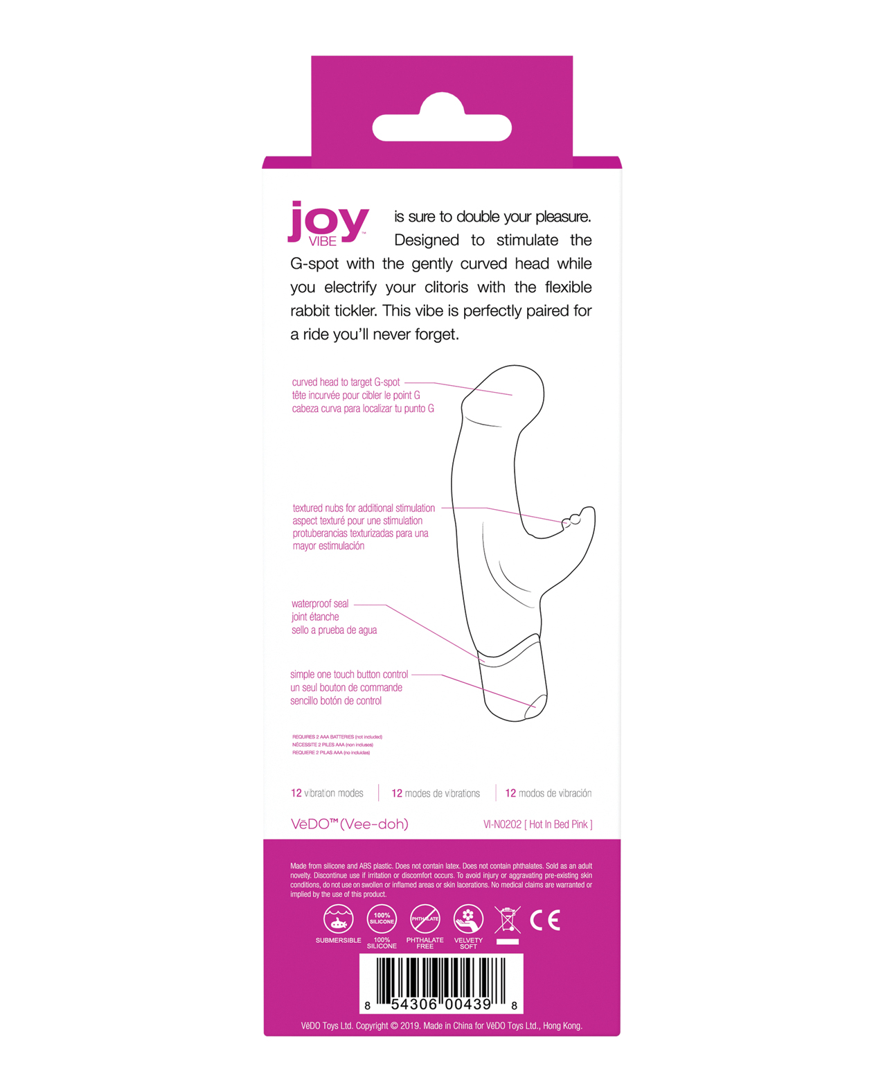 VeDO Joy VIBE is sure to double your pleasure. Designed to stimulate the G-spot with the gently curved head while you electrify your clitoris with the flexible rabbit tickler. This vibe is perfectly paired for a ride you’ll never forget. Powerful motor. 12 vibration modes. Two button easy control(TM). Extremely quiet. Velvety smooth silicone. Designed for G-spot pleasures. Waterproof. 2xAAA (not included). Running time 3 hours. Length: 22cm. Max diameter: 3.5cm.• 100% Silicone