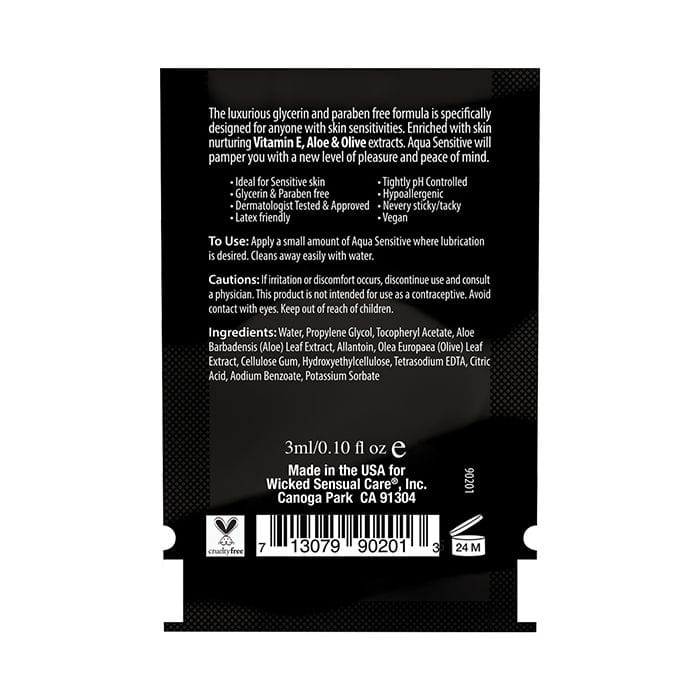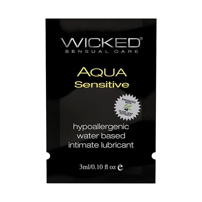 Indulge yourself and your most delicate areas with the incredibly smooth and satiny Wicked Sensual Care Collection Aqua Sensitive hypoallergenic lubricant. The luxurious Glycerin and Paraben Free formula is specifically designed for sensitive skin to heighten sensation & arouse satisfaction. Enhanced with skin nurturing Aloe & Olive extracts, as well as Vitamin E, Aqua Sensitive will caress you to new levels of pleasure. Aqua Sensitive is ideal for sensitive skin, hypoallergenic, latex friendly, glycerin and paraben-free, pH balanced, never sticky, dermatologist tested and approved, and vegan – no animal by-products or testing.