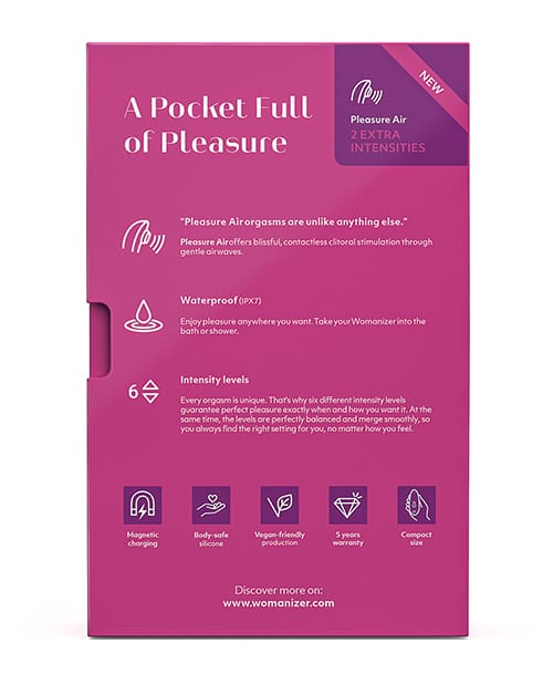 Compact sized clitoral stimulator for people seeking the unique sensations of Pleasure Air Technology. The new Womanizer STARLET 3 – it’s the original Womanizer Pleasure Air Technology combined with five new vivid product colors and two more intensity levels, while it’s still waterproof and USB rechargeable – for a reasonable price. 6 intensity levels – Every orgasm is unique. That’s why six different intensity levels guarantee perfect pleasure exactly when and how you want it. The intensity levels are perfectly balanced and offer the right setting for your every mood. Body fit – The sensual, slim design fits comfortably in your hand and becomes the perfect companion for even the most intimate moments.IPX7 Waterproof – You want to dive deeper? Since your WOMANIZER is IPX7 waterproof, nothing stands in the way of a long, relaxing bath, a refreshing shower or even a pool party. Materials : ABS plastic made without phthalates, BPA or latex. Dimensions : 117mm x 46mm x 47mm USB rechargeable – Run Time : 30 min Charge Time : 30 min Five Year Warranty.